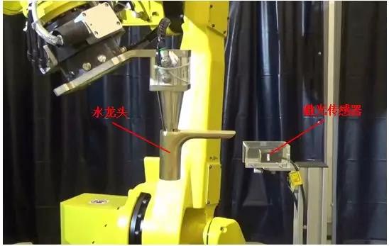 由于銅合金水龍頭產品在鑄造過程中容易產生外形輪廓偏差,為了保證產品的打磨程序能夠適應不同尺寸偏差的工件,確保產品不會因為尺寸偏差而導致過磨或欠磨的情況,提升系統的穩定性以及周邊設備的使用壽命。該系統配置了激光傳感器,通過掃描工件的外形輪廓,再通過內部算法計算偏差,將偏差數據補正給機器人,從而實現打磨程序的自動校準。